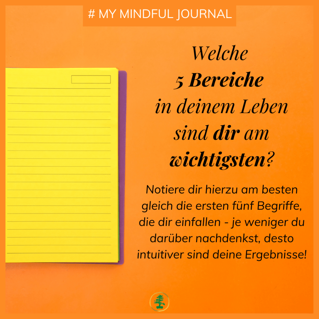 Wie wäre es, wenn du gleich einen ersten Schritt in diese Richtung unternimmst? Nimm dir einmal ein leeres Blatt Papier und schreibe dir die 5 Lebensbereiche, die dir am wichtigsten sind, auf. Notiere dir hierzu gleich die ersten fünf Begriffe, die dir einfallen – je weniger du darüber nachdenkst, desto intuitiver sind deine Ergebnisse!